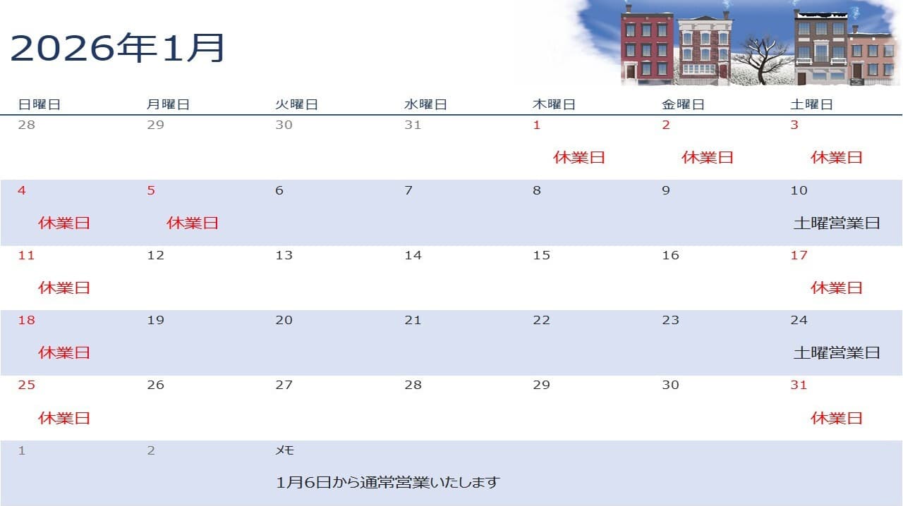 | 定休日 | 土(第2、第4)・日・祝日・年末年始・お盆期間中 |